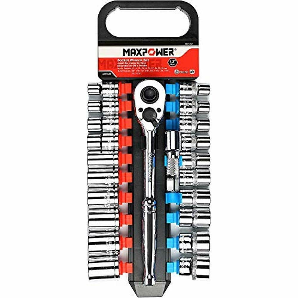 This 12-piece Socket Wrench Set includes nine 1/2-Inch drive socket wrenches. Includes 7/16-Inch, 1/2-Inch, 9/16-Inch, 5/8-Inch, 11/16-Inch, 3/4-Inch, 13/16-Inch, 7/8-Inch and 15/16-Inch 12-point sockets plus a 5/8-Inch spark plug socket, one ratchet and a 5-Inch extension. Keep all of pieces together in a compact hinged metal box.